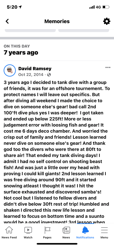 3 years ago I decided to tank dive with a group of friends, it was for an offshore tournement. To protect names I will leave out specifics. But after diving all weekend I made the choice to dive on someone else’s gear! bad call 2nd 100’ft dive plus yes I was deeper! I got taken and ended up below 225ft! More or less judgement error with loosing fish and gear! It cost me 6 days deco chamber. And worried the crisp out of family and friends! Lesson learned never dive on someone else’s gear! And thank god too the divers who were there at 80ft to share air! That ended my tank diving days! I admit I had no self control on shooting beast fish! And was just a little over my head with proving I could kill giants! 2nd lesson learned I was free diving around 90ft and it started snowing atleast I thought it was! I hit the surface exhausted and discovered samba’s! Not cool but I listened to fellow divers and didn’t dive below 30ft rest of trip! Humbled and shaken I directed this new life lesson and learned to focus on bottom time and a suunto would be a good investment! 3rd lesson when diving rigs and you battle a beast cobia or any giant fish and your gear gets wrapped up better to drop your belt and gun then not come home! Also all of these events happened about a year apart! I will say I’m blessed to dive with great divers, but will also say no matter how good you think you maybe, always dive with a buddy, always dive within your limits and if your pushing them be ready with people who are able to respond! Way too many of the above scenarios end up with a lost diver. We need to always remember to remain humble, learn from eachother and dive within our limits! I have lost guns, recently a belt, shifted to surface floats and float lines as a physical reminder I’m getting to deep and have a watch that’s my best friend! Yes I’ve done the dive alone thing and was stupid! Yes I’ve sot fish beyond my ability and landed them! And yes I have done the jig at the surface and sat in a tube for a week! I risked my life hard for what a fish, a dive, to prove something? Nope to learn from bad judgement be responsible enough to admit sometimes I push a little farther than I should! Be careful fellow waterman! Life’s a blessing take it from me I usually am on the rescue side of the house 16yrs so far I have served saving people who like me made bad choices got over their head! But even I a rescuer need to understand limits and am humble enough to say I’m sorry I made poor choices as my family, friends, and the fellow divers I was with didn’t need to carry my loss the rest of there lives! Just be humble, never be afraid to let him pass, and if shit gets real let your gun go or dump the belt! Amen and blessing to you all this winter! It’s about to get Jurassic in Gulf of Mexico with wahoo and big AJ’s at surface soon! Be ready, be prepared! And stay humble!