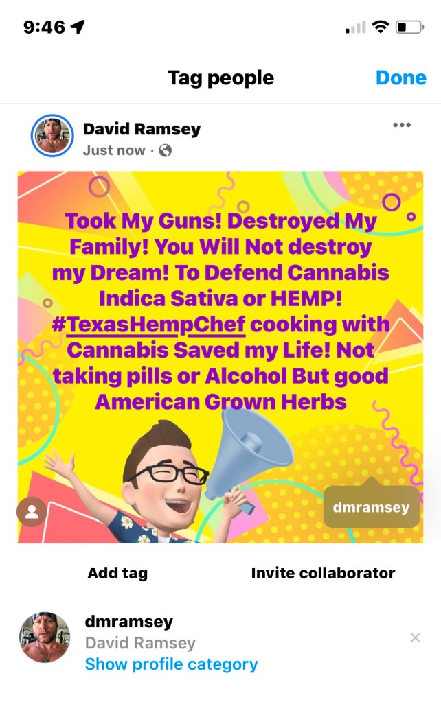 Took My Guns! Destroyed My Family! You Will Not destroy my Dream! To Defend Cannabis Indica Sativa or HEMP! #TexasHempChef cooking with Cannabis Saved my Life! Not taking pills or Alcohol But good American Grown Herbs #AmericanFarmers #AmericanBudTenders #americanownedandoperated #Farmers #Growers #Chefs #veteranshelpingveterans I defend freedom we the people and this nation under GOD! Iβm not a threat to myself or others Iβm an American! Iβm a Veteran Iβm a Citizen! πΊπΈππ―β€οΈπ±π΄ββ οΈπ‘ Put that in your pipe and smoke it! #NotTodayDevil itβs an HERB! #smokable #edible #usable for #clothing #medicine #plantbasedplastic itβs a Resource not to be destroyed! #LegalizePlantBasedHealing #HempGuideToHealthyEating #HighEnergyHealthyEating cost me almost 100days in Jail and loosing my rights for next 18mnths. Not to mention #BadCopsSuck #dmr #freedomaintfree from the #indigenous in my blood to the #italianimmigrants I come from! We The People Have the Right! #OneNationUnderGOD #Amen my prayer is the US Government Fully legalize Plant Based Healing and all forms of it! My Prayer is we the people come together to save the #policedepartment so they can better #ProtectandServe we come together to rewrite history and #MansLaw because GODS #10commandments are simple! #JudgementDay is here! BravoZulu