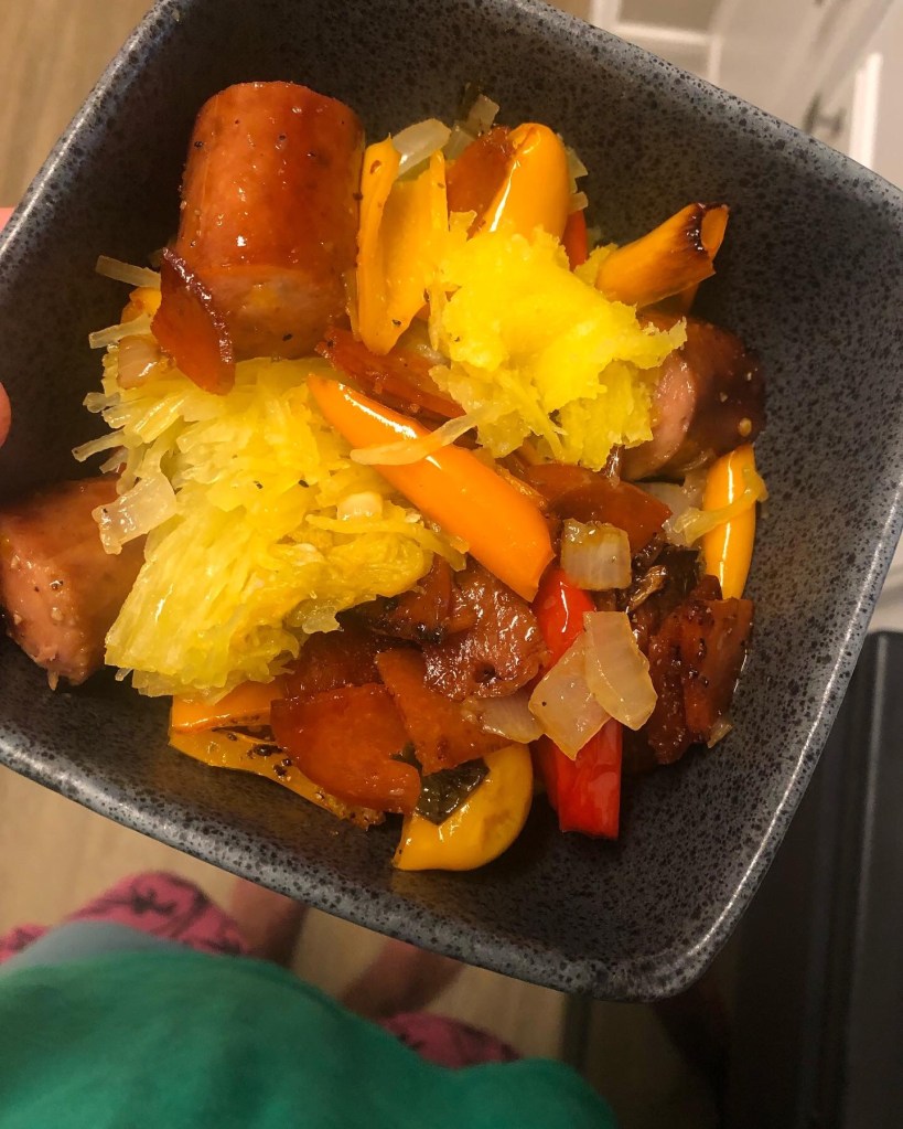 mealprep complete spaghetti squash jalapeño sausage mini peppers onions cilantro dash of Mrs dash and Cavenders thanks to @HEB I get fresh all the time #HighEnergyHealthyEating #TalkThatTalk cook that stuff @dmramsey1 #TexasHempChef Twitter @dmramsey Instagram