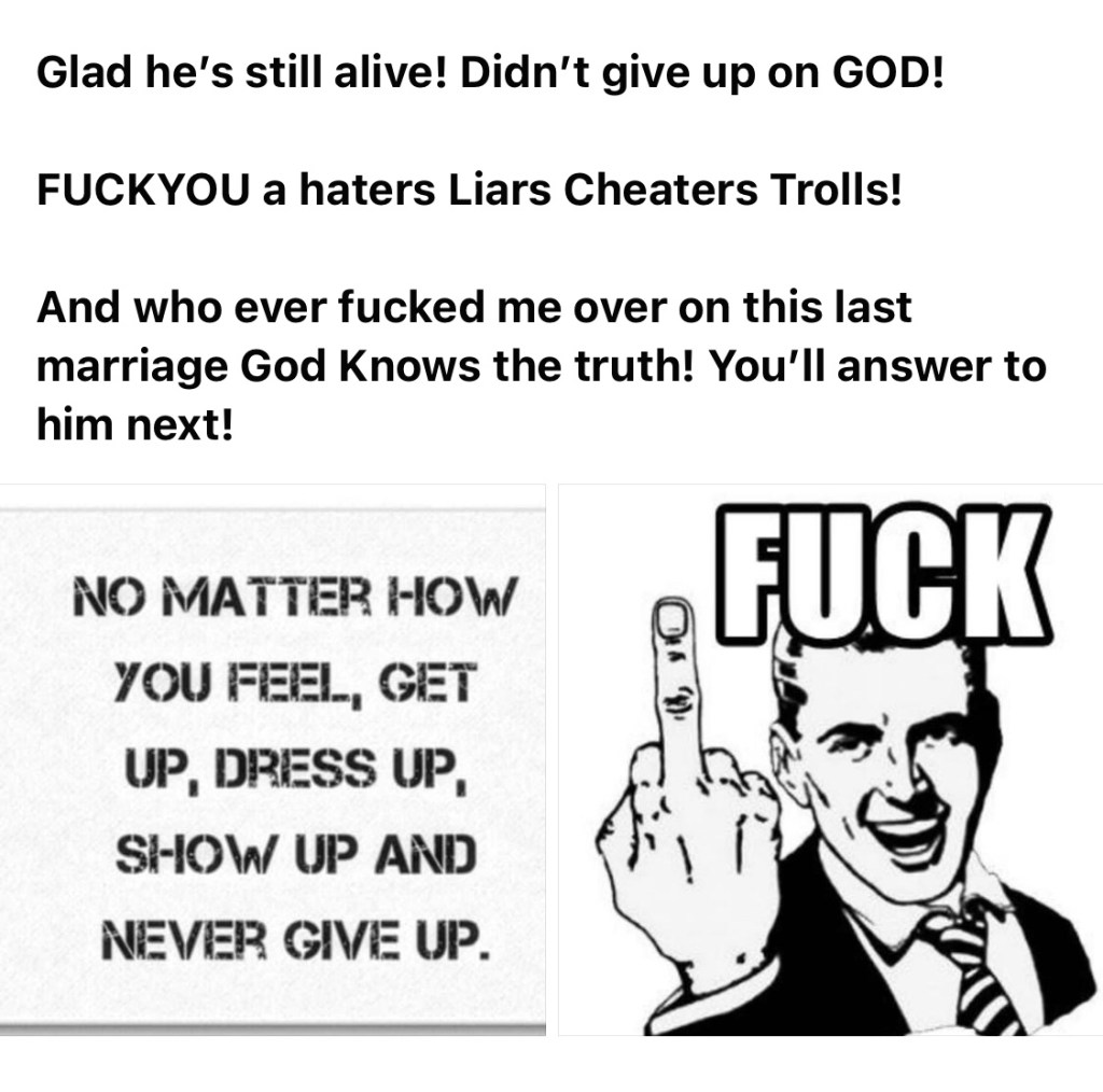 And who ever fucked me over on this last marriage God Knows the truth! You’ll answer to him next!