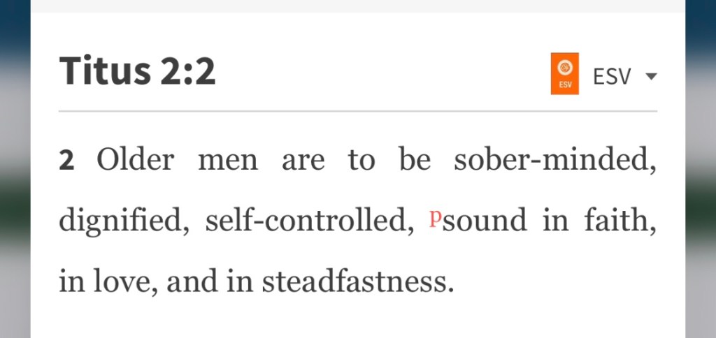 Tell older men to be #sober. Tell them to be men of good character, to use good judgment, and to be well-grounded in #faith, #love, and #endurance.
