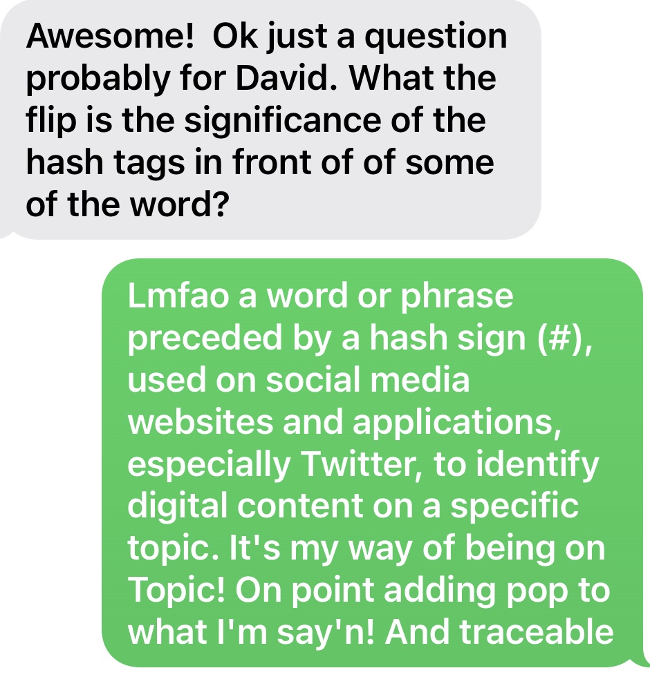 Lmfao a word or phrase preceded by a hash sign (#), used on social media websites and applications, especially Twitter, to identify digital content on a specific topic. It’s my way of being on Topic! On point adding pop to what I’m say’n! And traceable #hashtag mine #DMR I was also CoOwner The Chief Marketing Officer for a National Brand Patent and Trademark so it’s kinda my style if you will gator-Gripp.com now called Pull Set Gripp was previously called pro draw GatorGripp then GatorGrippHD now it’s the PSG #psg #pullsetgrip #pullsetgripp #prodraw #gatorgripp #gatorgripphd