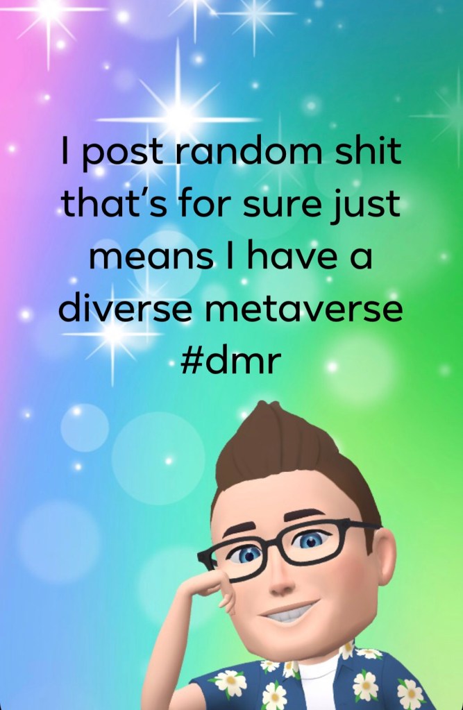 I post random shit that’s for sure just means I have a #diverse #metaverse #dmr showing a great deal of variety; very different. including or involving people from a range of different social and ethnic backgrounds and of different genders, sexual orientations, etc. di·verse that’s why #PostIt