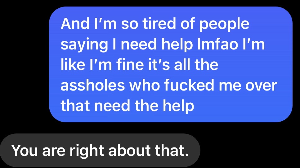 And I’m so tired of people saying I need help lmfao I’m like I’m fine it’s all the assholes who fucked me over that need the help